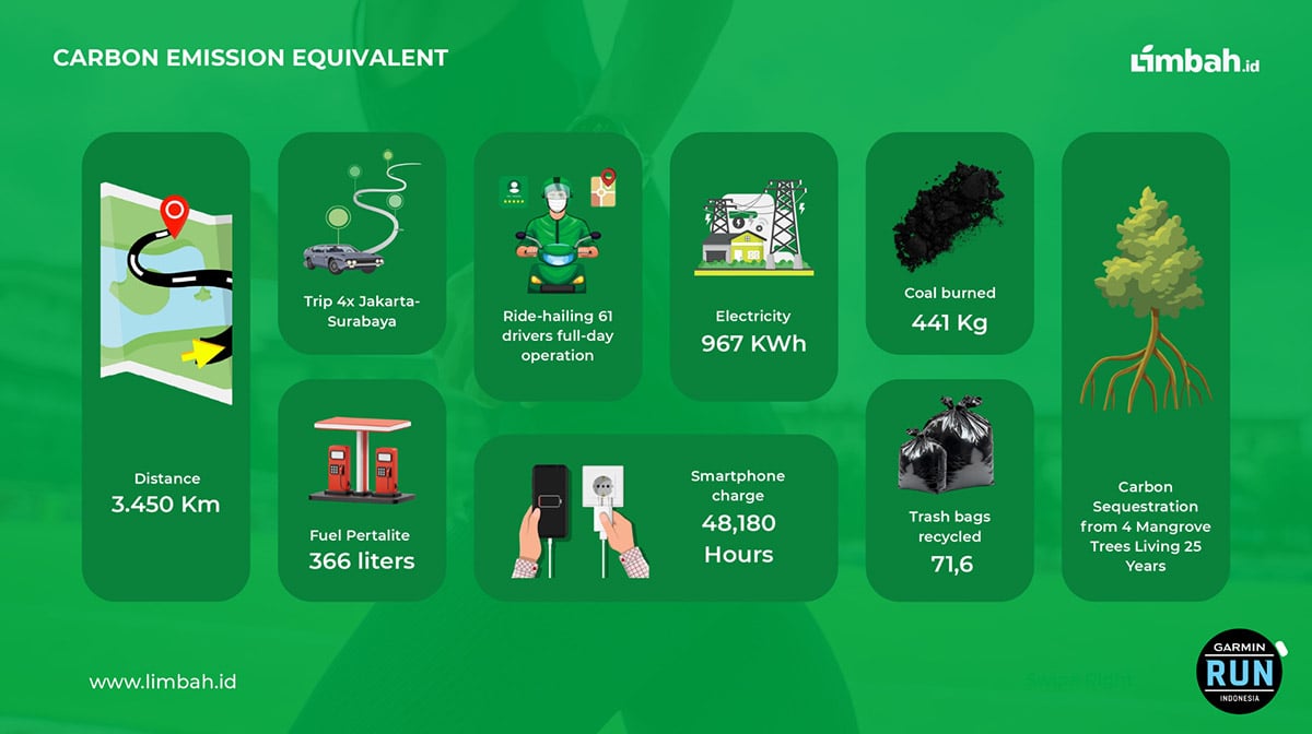 Melalui pengelolaan sampah berkelanjutan dan penerapan sistem zero to landfill, Garmin Run Indonesia 2025 bersama Limbah.id berhasil menekan emisi karbon hingga 29,1% atau setara penghematan 346,08 kgCO₂e. Sebagai gambaran, emisi karbon sebesar 346,08 kgCO₂e – setara dengan penghematan listrik sekitar 967 kWh atau empat kali perjalanan darat Jakarta–Surabaya. Hasil ini menjadikan Garmin Run 2025 sebagai contoh nyata penyelenggaraan event lari yang ramah lingkungan dan berkelanjutan.